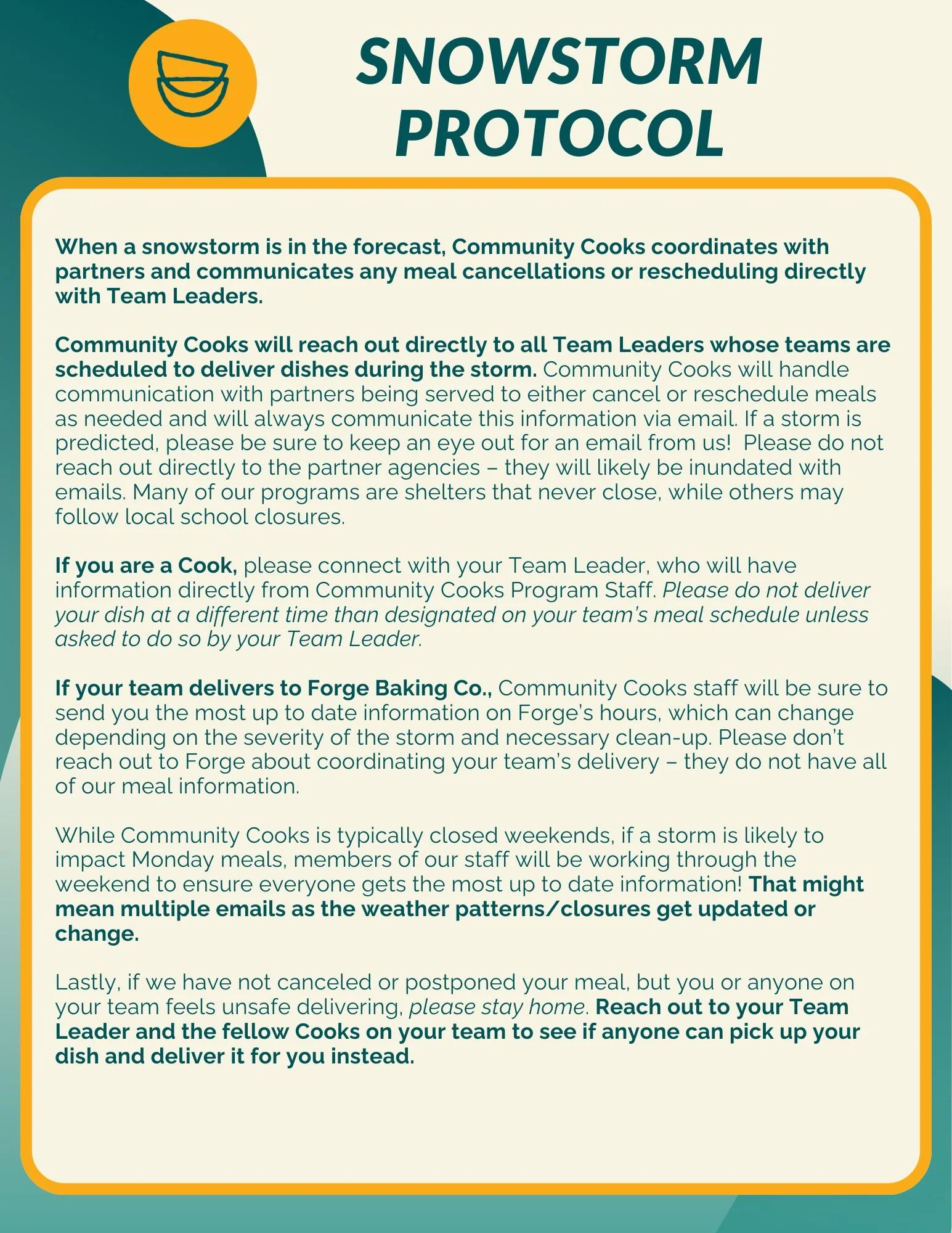 Scroll down for printable dish labels, New Cook FAQs, and our Snowstorm Protocol.Our next New Volunteer Orientations will be held in early spring. Stay tuned for details.